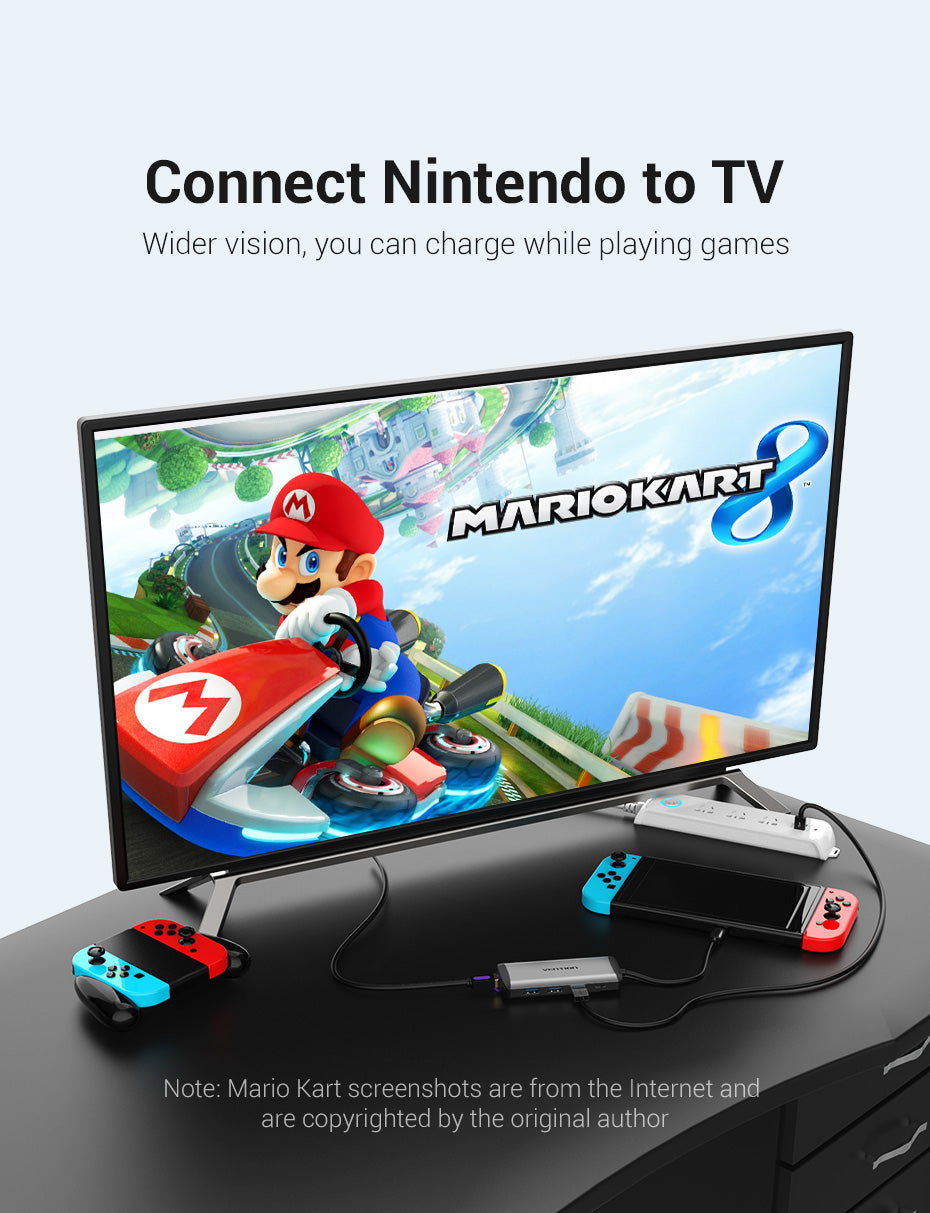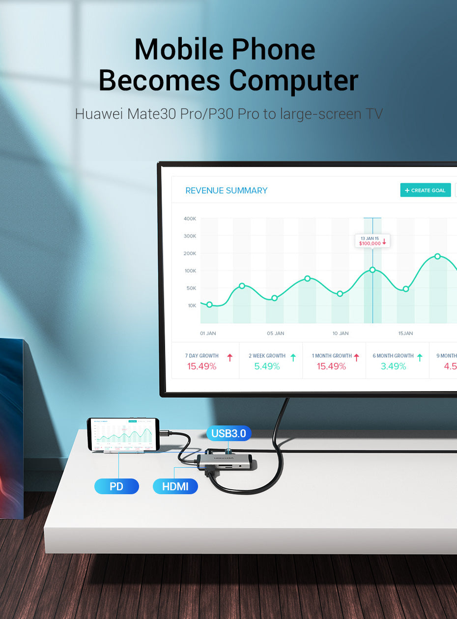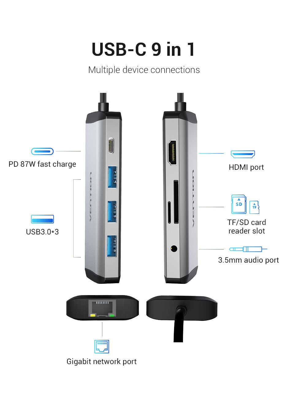 Vention Multi-function Type-C to HDMI/USB3.0*3/TF/SD/RJ45/3.5mm/PD Docking Station 0.15m Gray Metal Type