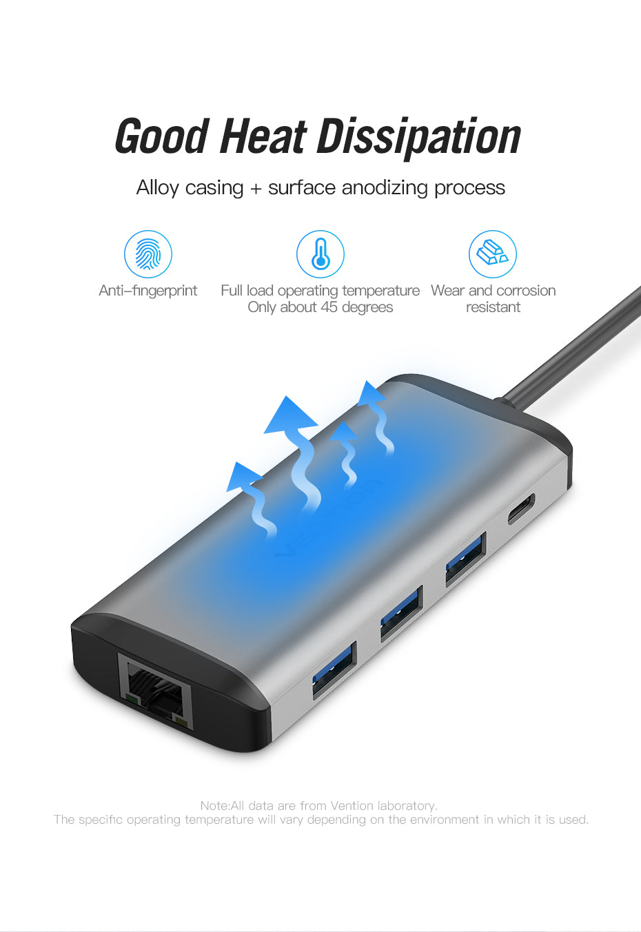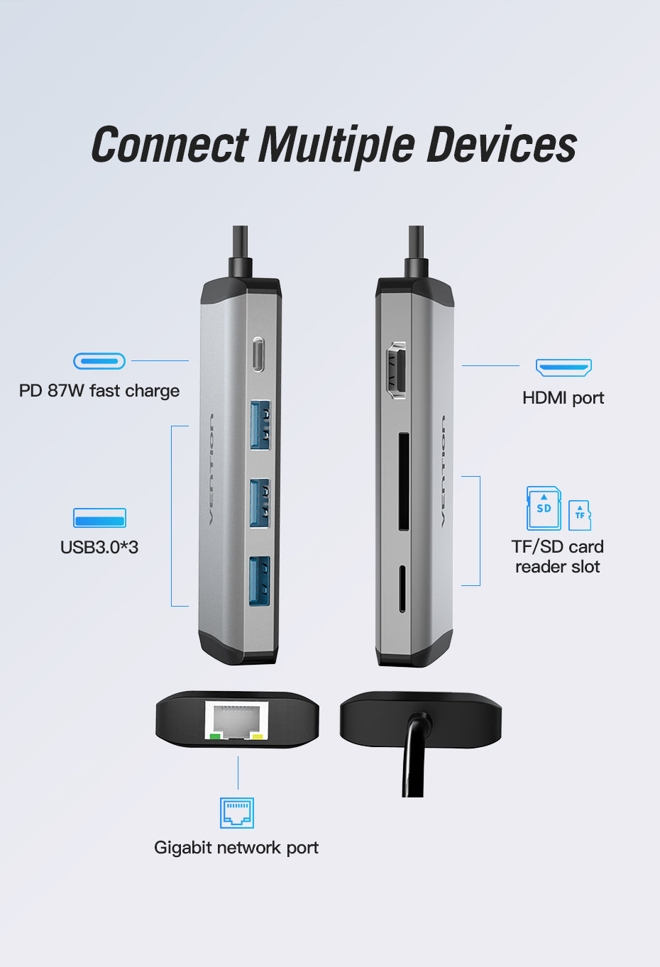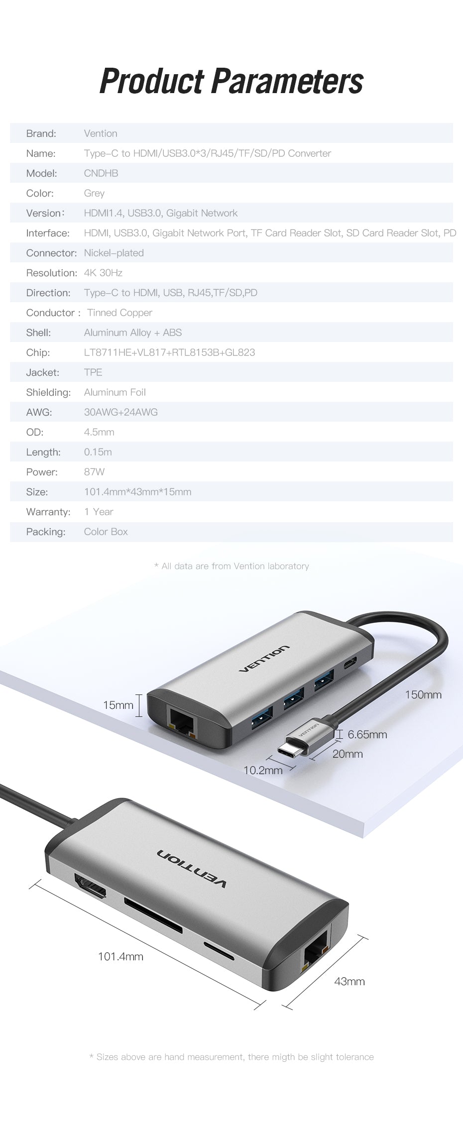 Vention Type-C to HDMI/USB3.0*3/RJ45/TF/SD/PD Converter 0.15M Gray Metal Type