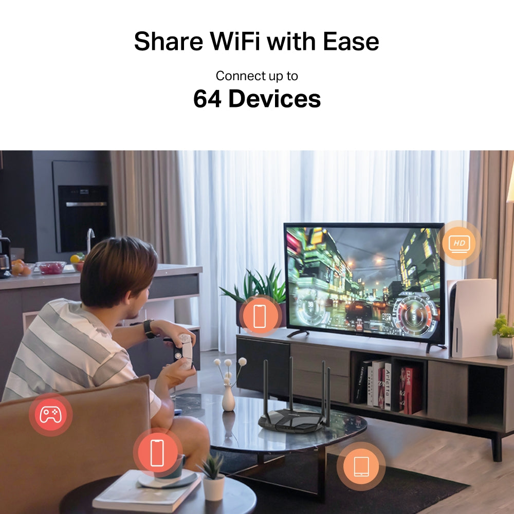 - Simultaneous Connection – Enjoy and share internet access with up to 64 Wi-Fi devices.