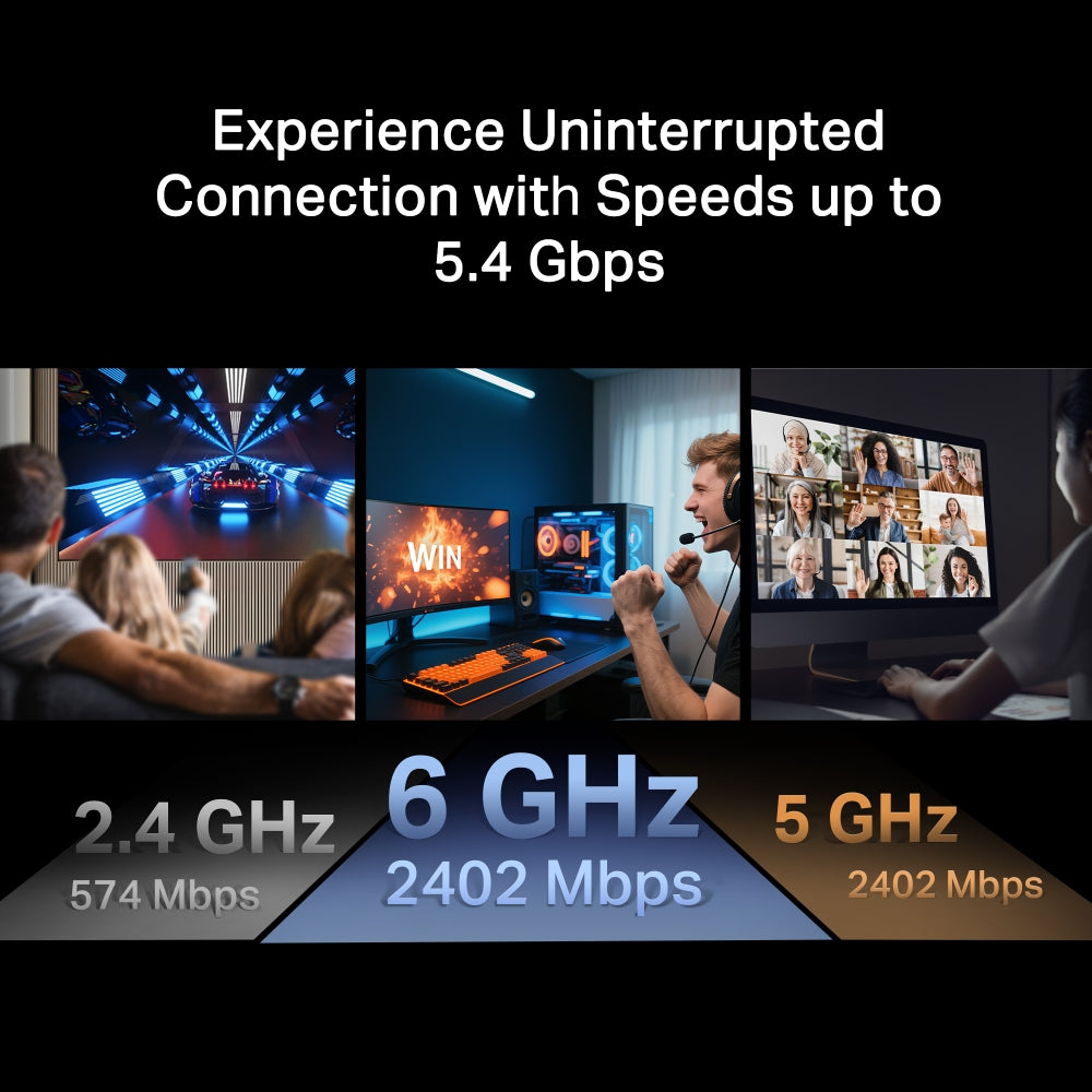 ‡Use of Wi-Fi 6 (802.11ax), Wi-Fi 6E, and features including OFDMA, MU-MIMO, 1024-QAM, or HE160 require APs to also support the corresponding features. The 160 MHz bandwidth may be unavailable in the 5 GHz band in some regions/countries due to regulatory restrictions.